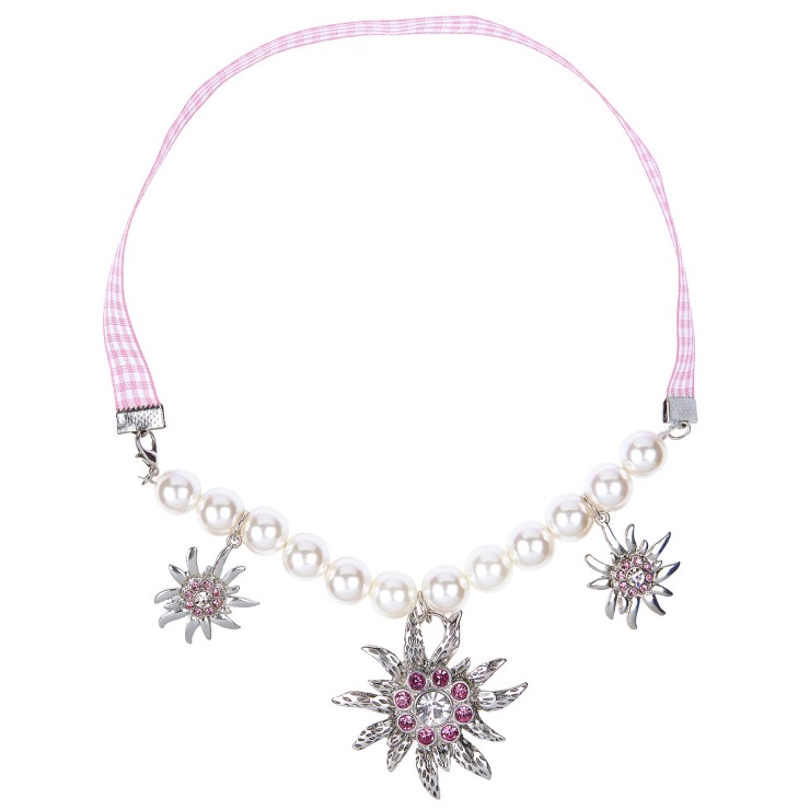 Ce collier de fausses perles est décoré de pendentifs argentés.